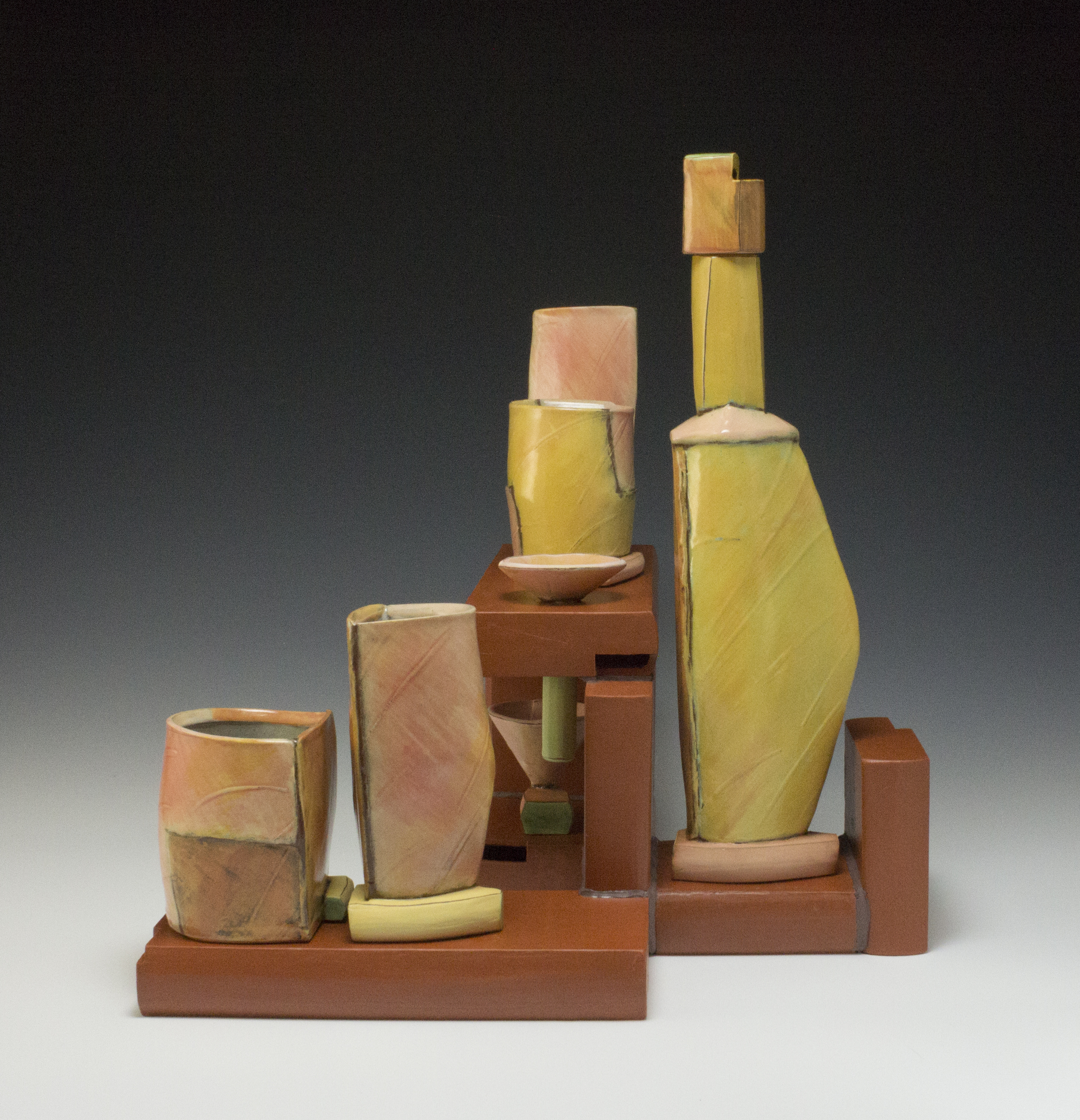 The culmination of my research is a body of functional pottery. Geometric forms combined with painted color become utilitarian three dimensional color field paintings. Individual vessels and function-specific sets reference skyline and double as musical phrasing or a waveform of sound. The exhibition design is a hybrid of a home interior and gallery space using display furniture that references tables as well as the pedestal. The walls are engaged with painted elements and shelves holding sets of pottery.